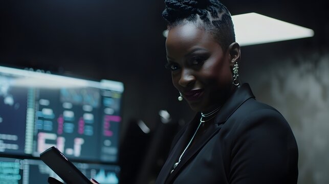 African american businesswoman standing in modern office and using tablet device. Beside her colleagues