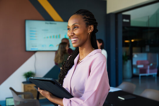 Confident businesswoman using a digital tablet in a modern office. Professional woman smiling while working on a touchscreen device with colleagues in the background having a meeting.