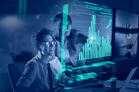 Smiling Businesswoman With Digital Network Interface In Modern Office Images
