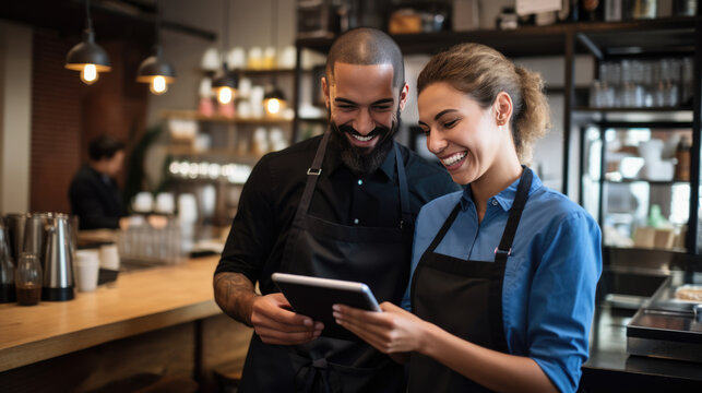 Smiling Cafe Staff Collaboration Using Digital Tablet Images