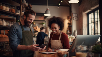 Cafe worker and manager smiling and engaging with each other while using a tablet
