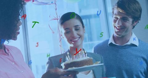 Smiling professional celebrating office birthday with cake, candles and analytics overlays
