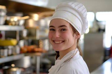 Female chef wearing apron in kitchen smiling confidently