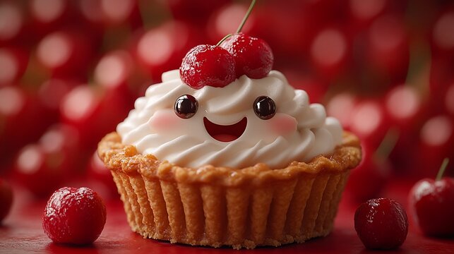 Cute smiling tart with whipped cream, two cherries on top, surrounded by red cherries