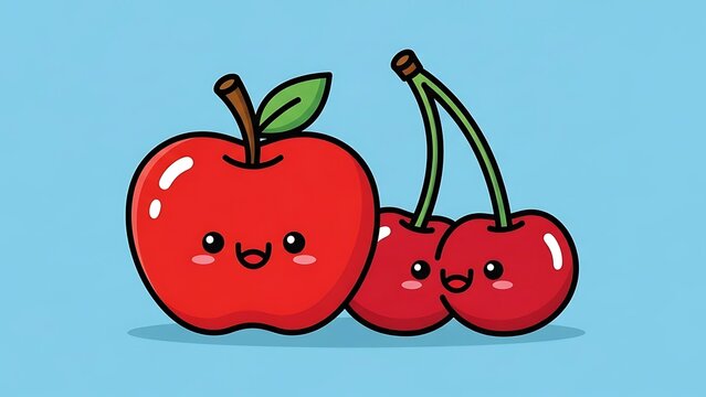 A cute cartoon illustration of two smiling cherries with green leaves, set against a pale turquoise background