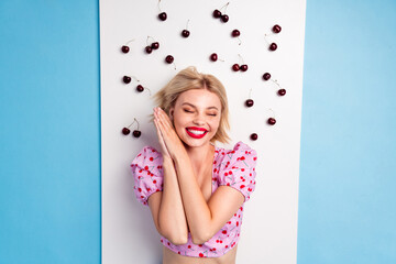 Young blonde woman smiling in a cherry patterned top, lying against a blue and white backdrop with scattered cherries