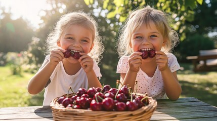 Two joyful young girls, smiling and holding cherries, are enjoying a sunny day outdoors, surrounded by nature, with a basket of fresh cherries on a wooden table