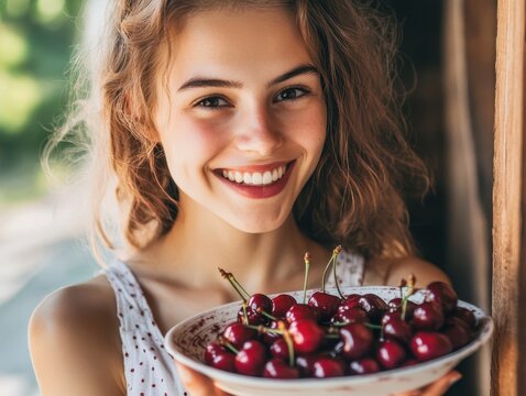 Woman holding fresh cherries smiling outdoors in summer with a straw hat and vibrant greenery background