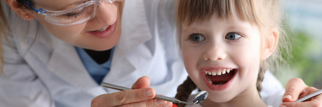 Woman dentist in protective glasses examines teeth of little girl patient with metal tools portrait. Preventive examinations of oral cavity in children concept.