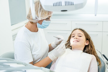 A girl of 10 years old in protective glasses sits smiling in a dental chair before starting treatment in a dental clinic. In the frame, the dentist's hands in blue gloves with tools
