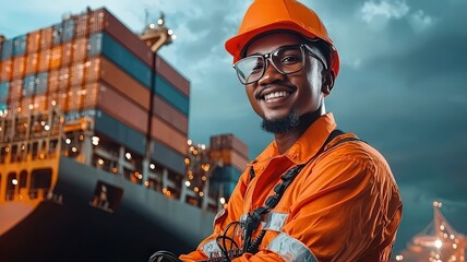 Smiling construction worker wearing an orange uniform and helmet standing in front of shipping containers. Construction industry, shipping logistics, safety equipment, outdoor work, heavy machinery.