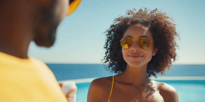 Couple enjoying a sunny day by poolside