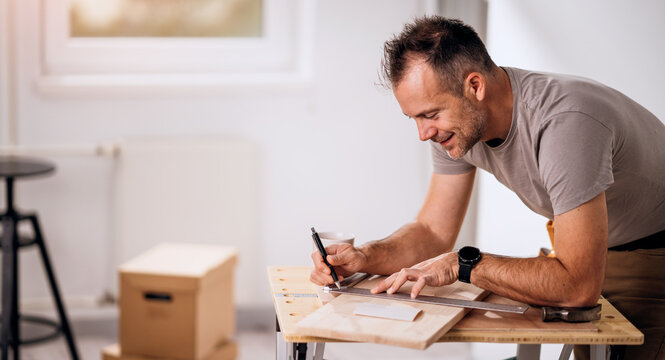 A young smiling man in casual clothes stands at a table with construction tools. An attractive builder at a warehouse workplace.