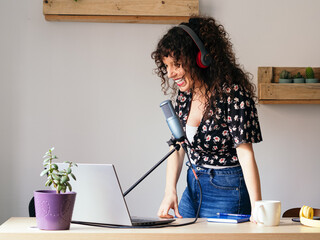 Smiling content creator recording podcast in modern home office