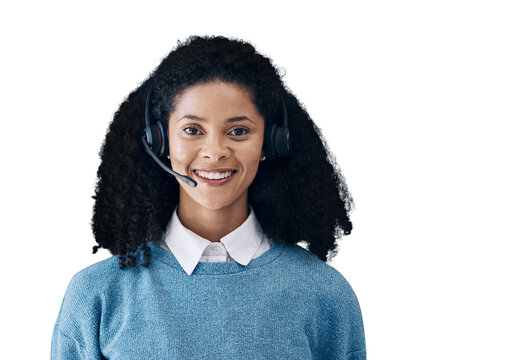 Happy woman, face and portrait with headphones for call center isolated on a transparent PNG background. Female person, consultant or agent smile with headset in customer service or telecommunication