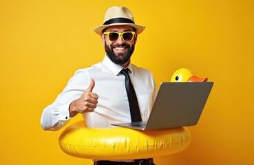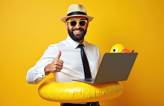 Office worker on vacation uses laptop. Happy businessman in sunglasses wearing inflatable ring. Man in shirt with tie shows thumbs up gesture. Online work concept.
