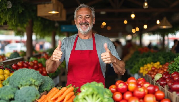 Smiling farmer with red apron gives thumbs up. Fresh colorful vegetables like carrots broccoli and tomatoes are displayed at outdoor market stall. Healthy food assortment is ready for sale.