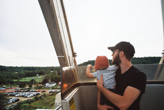 ugc of smiling father and toddler daughter at local fair in summer