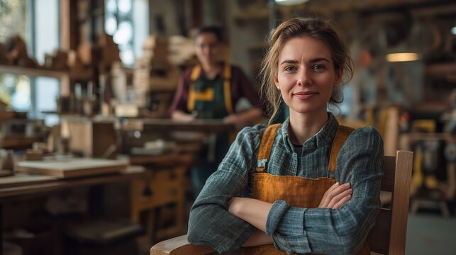 Young female carpenter skillfully crafting wood projects in a carpentry workshop environment
