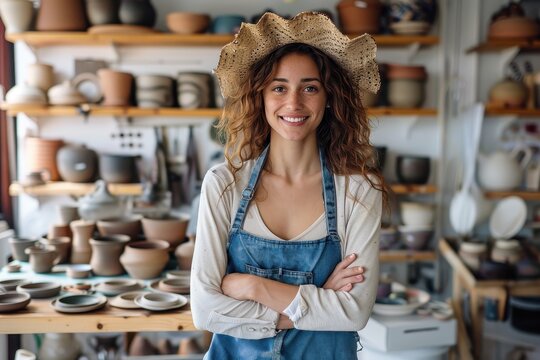 A radiant female potter wearing a straw hat poses confidently in her ceramic workshop, surrounded by her artisanal creations