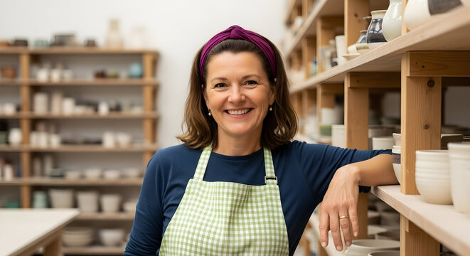 Smiling woman in pottery shop surrounded by handmade ceramics. She is happy and proud of her work. Shelves filled with various pots and vases.