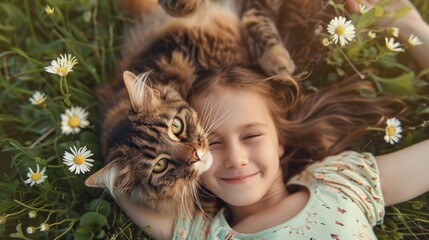 Cat selfie with little girl on grass field with flowers outdoor.