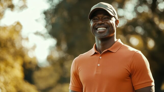 African 40's corporate golfer smart wearing polo shirt and cap, smiling.