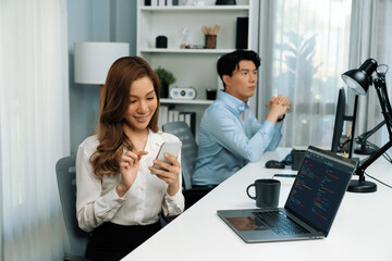 Profile smiling beautiful Asian businesswoman checking email on smartphone with laptop at modern office on working desk casual day. Blurry background man colleague analyzing data on pc. Infobahn.