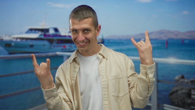 Man smiling in front of yacht at seaside showing rock hand gesture with ocean and mountains in background under blue sky