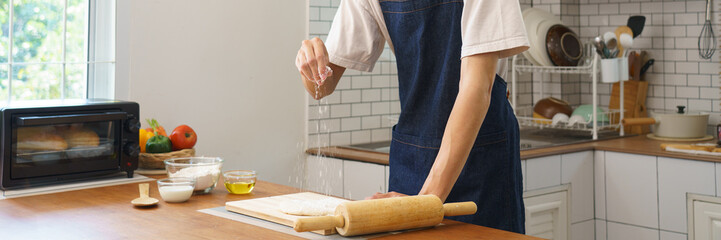 Man preparing to bake by sprinkling flour in rustic kitchen