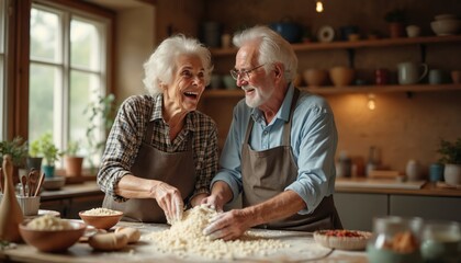 Elderly couple laugh while making dough in a rustic kitchen. They prepare food together at home with joy. Senior man and woman enjoy bonding while baking.