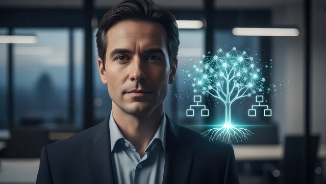 Confident, professionally dressed businessman with a serious expression and dark hair, stands in a modern office environment alongside a glowing, futuristic digital tree network illustration with