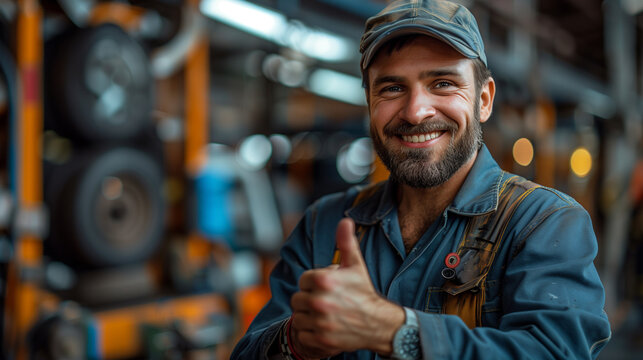 A smiling mechanic in overalls and a cap gives a thumbs up sign, indicating good service and customer satisfaction at an auto repair shop.