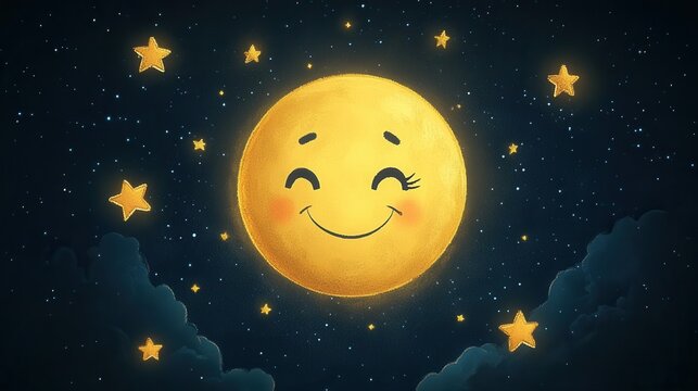 A dark blue background with a smiling crescent moon and twinkling, simple star shapes