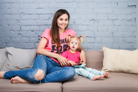 beautiful young mother uses a smartphone to play with a two-year-old daughter sitting on the couch in the room Dressed in bright colors, colored clothes