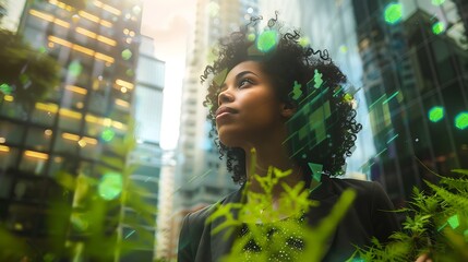 Woman standing in a modern city looking up, a vision of a futuristic city and technology overlay on her.