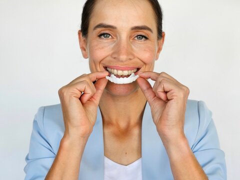 Smiling mature woman at outdoor family dinner with candlestick stock chart overlay