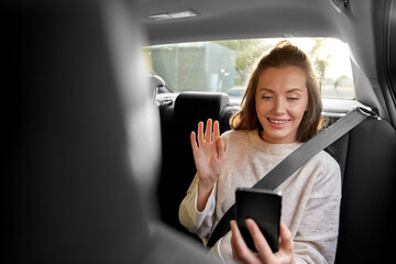 Passenger using smartphone with augmented reality analytics in rear car seat, futuristic hud