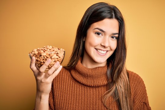 Young beautiful girl holding bowl of salty peanuts standing over yellow background with a happy face standing and smiling with a confident smile showing teeth