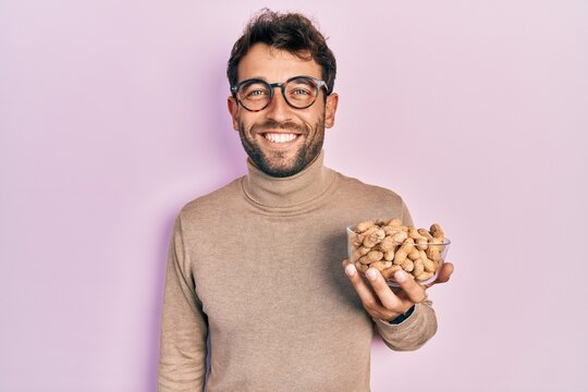 Handsome man with beard holding peanuts looking positive and happy standing and smiling with a confident smile showing teeth