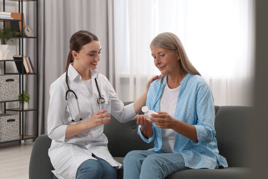 Young healthcare worker giving glass of water to senior woman with pills indoors