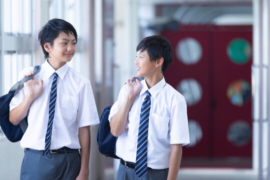 青空の下で登校時に笑顔を見せる制服姿の高校生たちの青春スナップ(教育 広告 ライフスタイル)