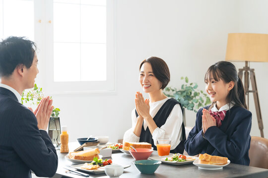 食卓でいただきますして手をあわせる親子