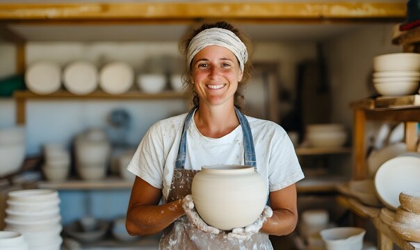 A potter proudly holding a newly finished ceramic piece, with other pottery works in the background