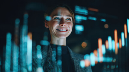 Woman smiles while looking at digital data visualizations on screen, showcasing graphs and statistics. atmosphere is modern and tech focused, reflecting sense of achievement and innovation
