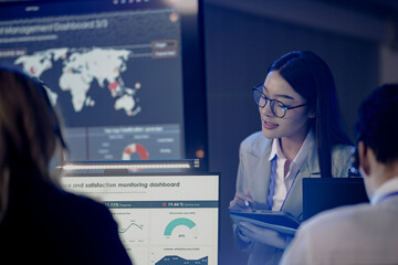 A smiling Asian female professional with glasses calmly uses a tablet and stylus reviewing digital dashboards in a modern tech office environment efficiently managing her workflow.