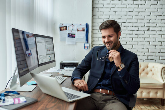 Good news. Young happy businessman or financial analyst sitting at his workplace in the modern office, working on laptop and smiling. Analyzing statistical data