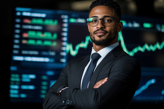 Confident young financial analyst smiling in a modern trading environment with stock market data displayed on screens highlighting trends and opportunities in economic analysis