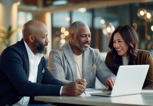 Three diverse business people, colleagues sit around an open laptop, smiling and using tablets to discuss documents for a new marketing campaign in a modern, casual office setting.