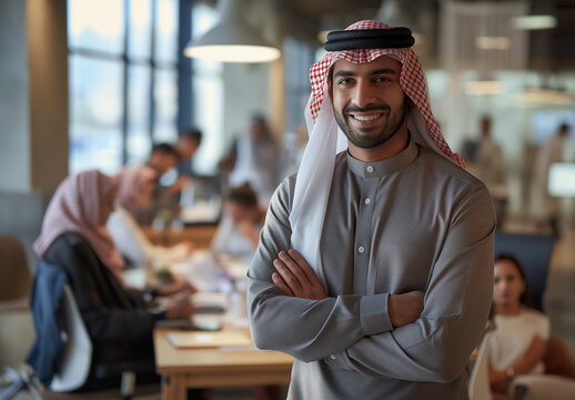Smiling man in formal attire holds a tablet in a modern office setting. Behind him, colleagues engage in a discussion, creating a collaborative vibe during work hours.